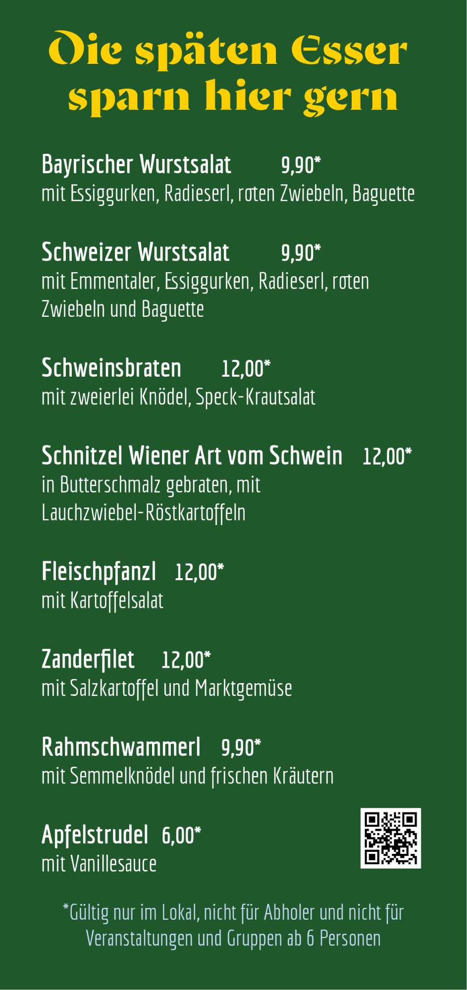 *Gültig für alle, die spontan zum Essen ins Lokal kommen. Keine Abholer,gilt nicht für Veranstaltungen und Gruppen ab 6 Personen, Zusätzlich gilt auch die Standardkarte. Gilt nur werktags, nicht an Feiertagen und Sonntagen.